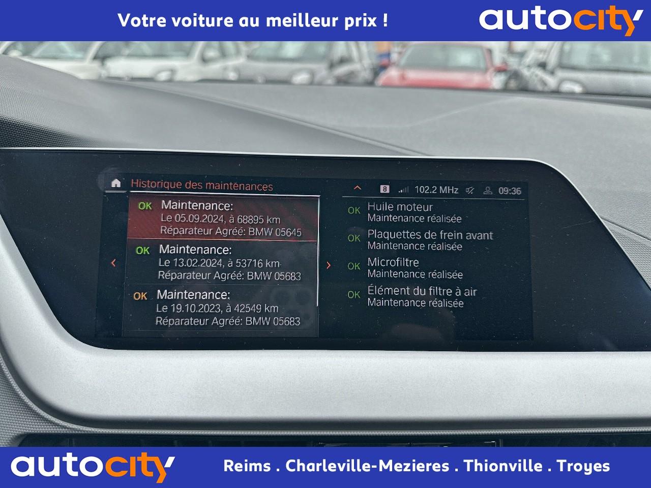 Accoudoir central avant coulissantAide au maintien dans la voie avec avertisseur de franchissement de ligne et correction de trajectoireAirbag passager déconnectableAirbags conducteur et passagerAirbags latéraux avantAirbags rideauxAluminium Line satiné BMW IndividualBMW Live Cockpit Navigation PlusBoîte de vitesses manuelle 6 rapportsCiel de pavillon anthraciteClimatisation automatiqueContrôle de freinage en courbe CBCContrôle dynamique de la stabilité DSCContrôle Dynamique de la Traction DTCDémarrage sans cléDétecteur de pluie et allumage automatique des projecteursEcrous antivolFeux de jour à LEDFixations ISOFIX aux places arrièreIndicateur de limitation de vitesseInserts décoratifs"Quartz Silver" mat grainéJantes alliage 17" style 548 bicolores Orbit Grey/AluminiumKit de mobilité BMWKit rangementPack Connected ProPark AssistPeinture métalliséeProjecteurs antibrouillard à LEDProtection active des piétonsRégulateur de vitesse avec fonction freinage en descenteRétroviseur intérieur anti-éblouissementRétroviseurs extérieurs rabattables électriquementSellerie Tissu "Grid" AnthraciteSiège passager réglable en hauteurSystème anti-collision à basse vitesseSystème antiblocage des roues (ABS)Tapis de sol en veloursTuner DABVolant gainé cuir avec touches multifonctions
