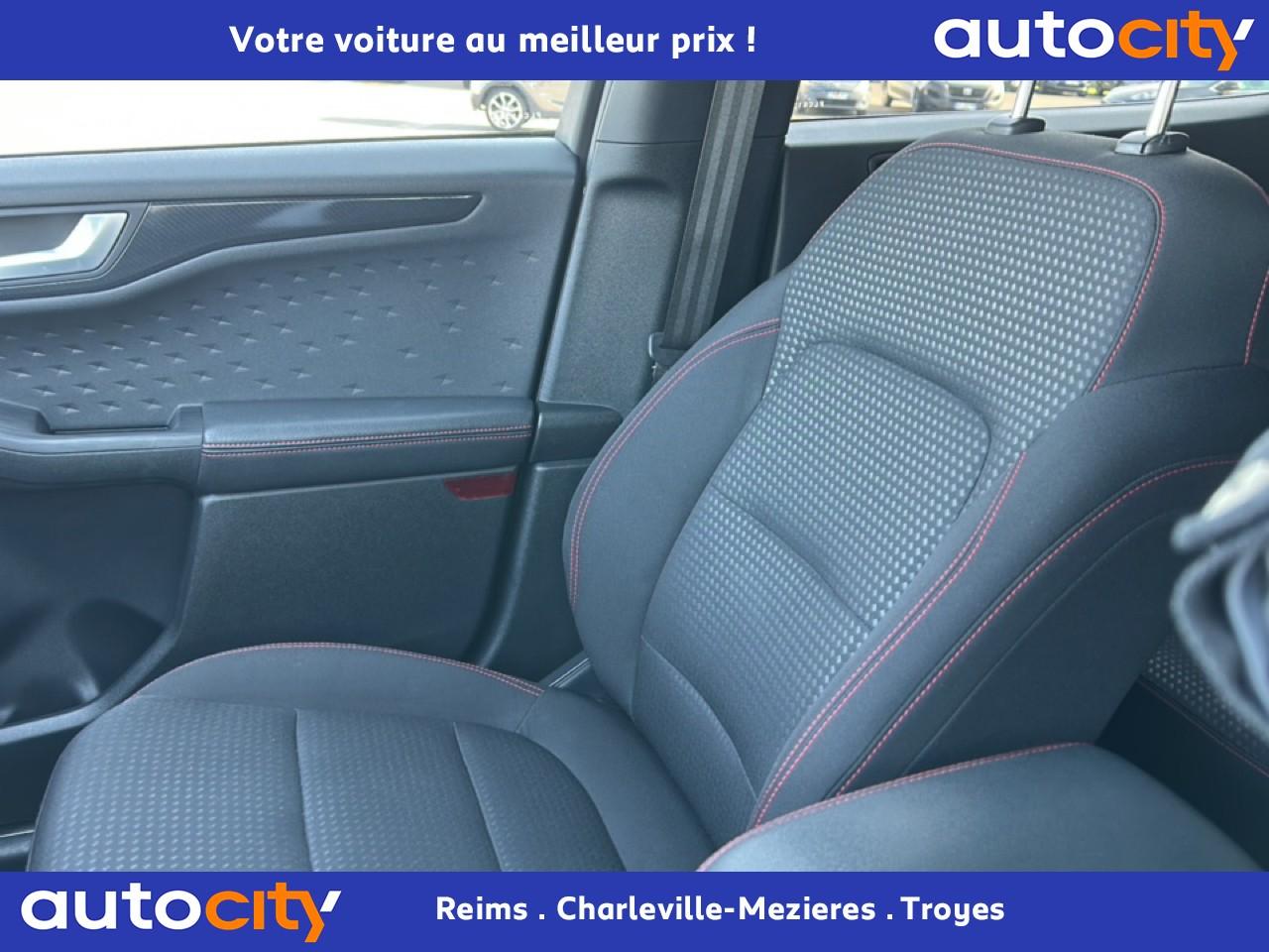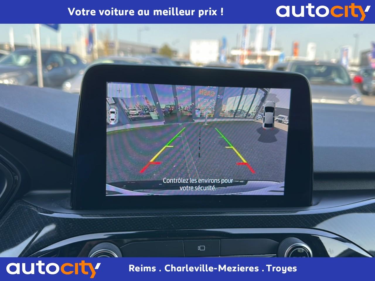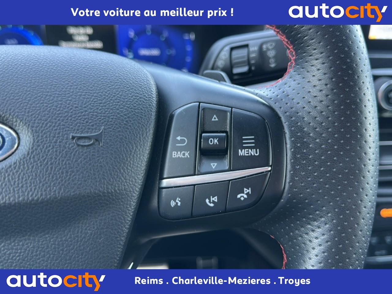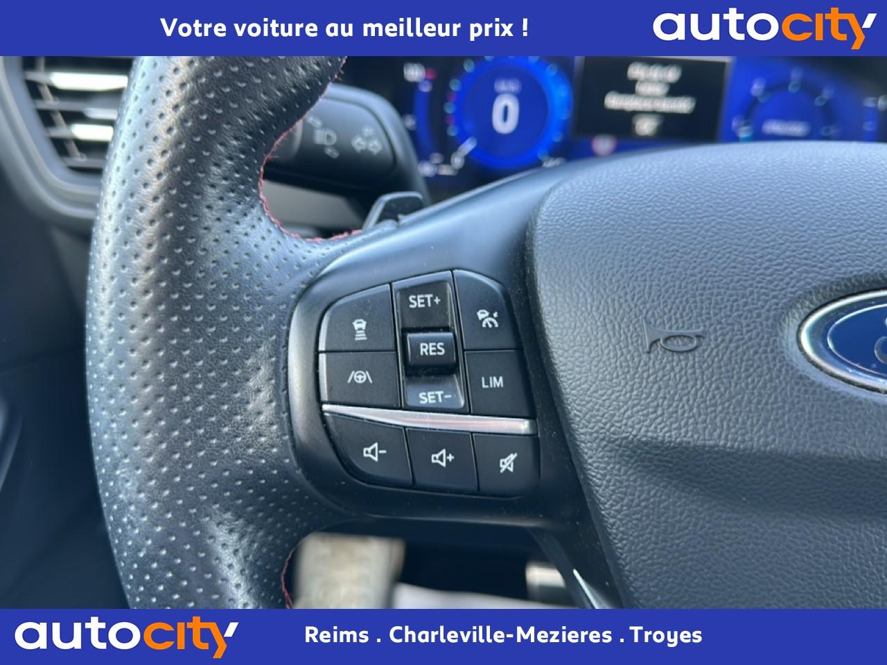 2 Fixations Isofix à l'arrière2 ports de charge USB situés dans la console centrale3 appuie-tête arrière3 Modes d'alimentation sélectionnables (Auto, Now, Later)3ème feu stop arrière5 ceintures de sécurité 3 pointsAide au démarrage en côteAide au stationnement avant/arrièreAir conditionné à régulation automatique 2 zonesAirbags frontaux, latéraux (thorax) et rideauxAlerte de franchissement de ligne avec maintien de voieAllumage automatique des essuie-glacesAllumage automatique des projecteursAnneaux d'arrimage dans le coffreAntiblocage ABSAntipatinageAssistance au freinage d'urgenceAube de calandre de radiateur KysorBadges ST-LineBanquette arrière coulissante et rabattable 60/40Barres de toit noiresBecquet arrière couleur carrosserieBouton de démarrage Ford Power - démarrage du moteur sans cléCache-bagages amovibleChargeur de smartphone par inductionCombiné d'instrumentation numérique 12,3" avec EcomodeConsole centrale avec accoudoirContrôle de stabilité anti-retournement - RSCContrôle du roulis de la remorque (TSC)Correcteur électronique de trajectoire ESPDésactivation de l'airbag du passager avantDirection assistée électriqueDisques de frein arrièreDouble sortie d'échappement ST-LineE-Shifter - Sélecteur de vitesse rotatifEclairage d'ambiance intérieurEclairage d'approche dans rétroviseurs extérieursEclairage dans le coffreEclairage de la boîte à gantsEntourage de vitres noirEtriers de frein rougesFeux antibrouillard à LED avec éclairage d'angleFeux arrière à LEDFeux de jour à LEDFordPass Connect avec modem embarqué 4 et fonction eCallFrein de stationnement électriqueGrille de calandre ST-LineJantes alliage 18" 5x2 branches finition ST-Line avec pneus Summer BSW 225/60 R18Kit carrosserie ST-LineLimiteur de vitesse intelligentMoulure de cadre de porte inférieure noireMoulure de cadre de porte supérieure chroméOrdinateur de bordOuverture du Hayon Motorisé avec commande à distancePack AssistancePalettes au volantPare-brise acoustiquePare-brise en verre laminéPare-chocs couleur carrosseriePare-soleil avant avec miroir de courtoisie éclairéPédalier en aluminiumPeinture non-métallisée Bleu AbyssePhares halogènesPlancher de coffre ajustablePlaques de seuils de portes avant ST-LinePoignées de portes couleur carrosseriePoignées de portes intérieures chroméesPrise 12V à l'avantPrise 12V dans le coffrePrise 12V sur la console centraleRétroviseur intérieur électrochromeRétroviseurs extérieurs couleur carrosserieRétroviseurs extérieurs rabattables électriquement et dégivrantsRoue de secours galette 17" avec pneus 165/70 R17Sécurité enfant avec verrouillage électrique des portes arrièreSellerie tissuSiège conducteur réglable en hauteur avec soutien lombaire (8 positions)Siège passager réglable en hauteur avec soutien lombaire (8 positions)Sièges avant sportStop & StartSuspensions sportSystème audio bi-tuner AM/FM Ford SYNC 3, avec écran tactile 8" DAB, commandes vocales, 2 ports USB, compatible AppLink, Apple CarPlay et Android auto, 6 haut-parleursSystème de Navigation Europe et points d'intérêt MichelinSystème de rappel du port des ceinturesSystème de surveillance de pression des pneusSystème Keyfree (ouverture et démarrage mains libres)Système MyKey (seconde clé programmable)Tapis de coffre moquetteTapis de sol avant et arrière ST-Line avec surpiqûres rougesTrappe à carburant Ford EasyFuelVerrouillage centralisé à distanceVitres avant et arrière électriquesVolant à méplat 3 branches Sensico ST-Line avec surpiqûres rougesVolant réglable en hauteur et en profondeur