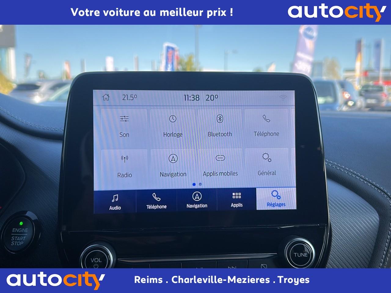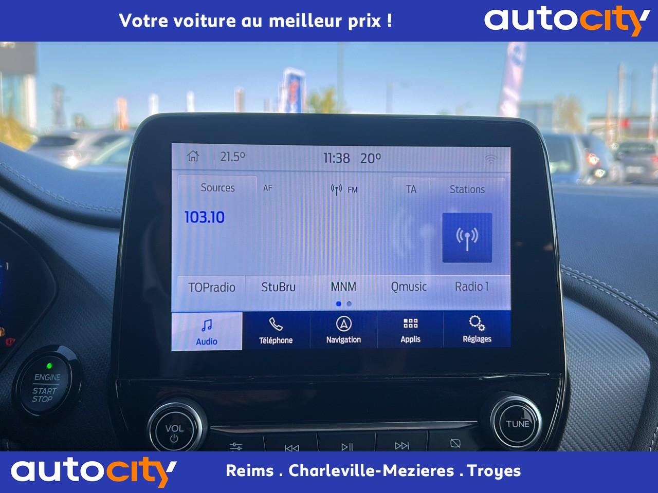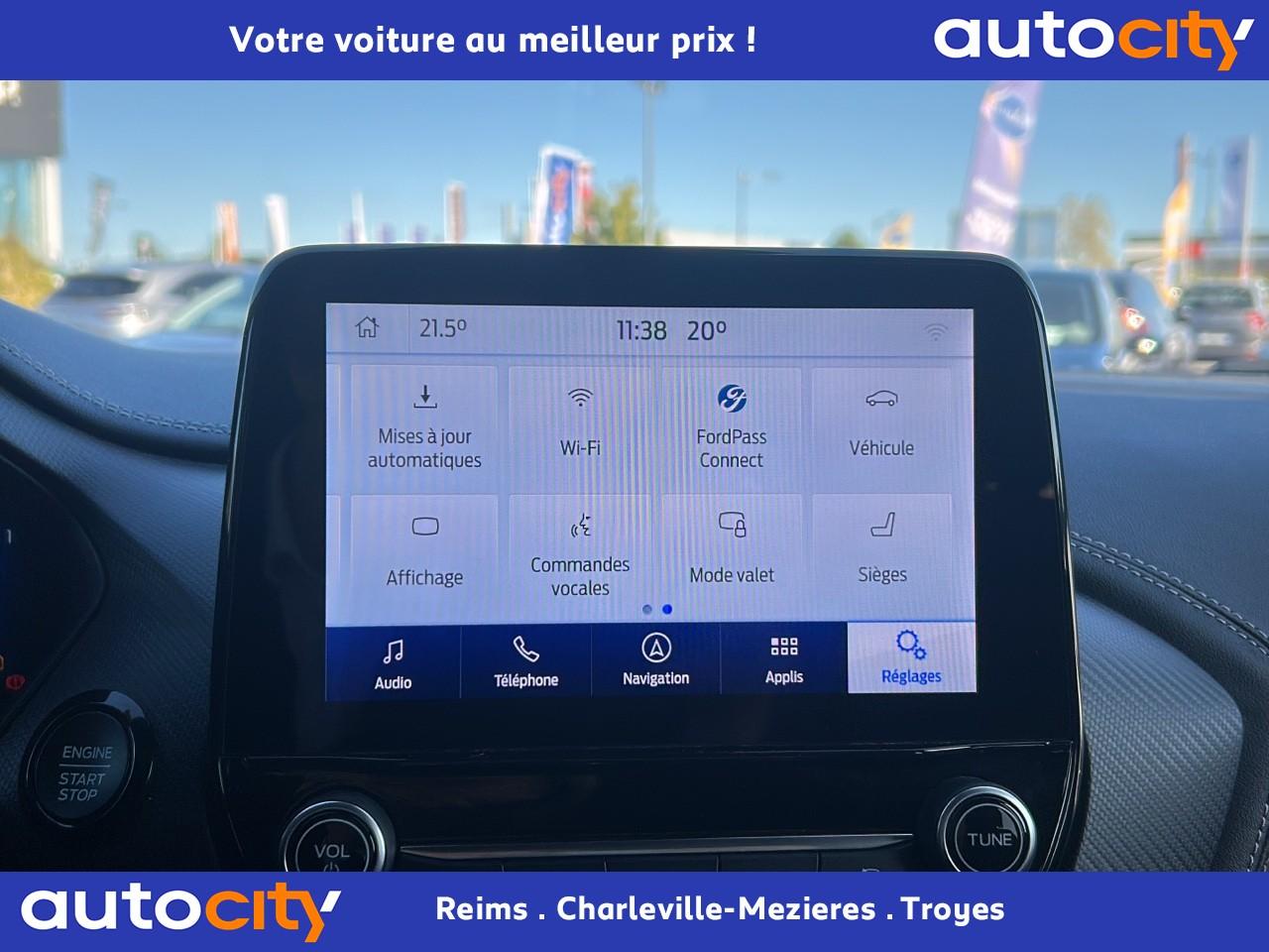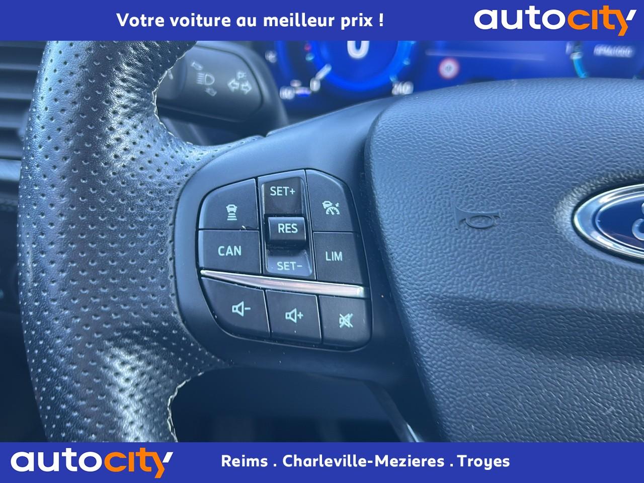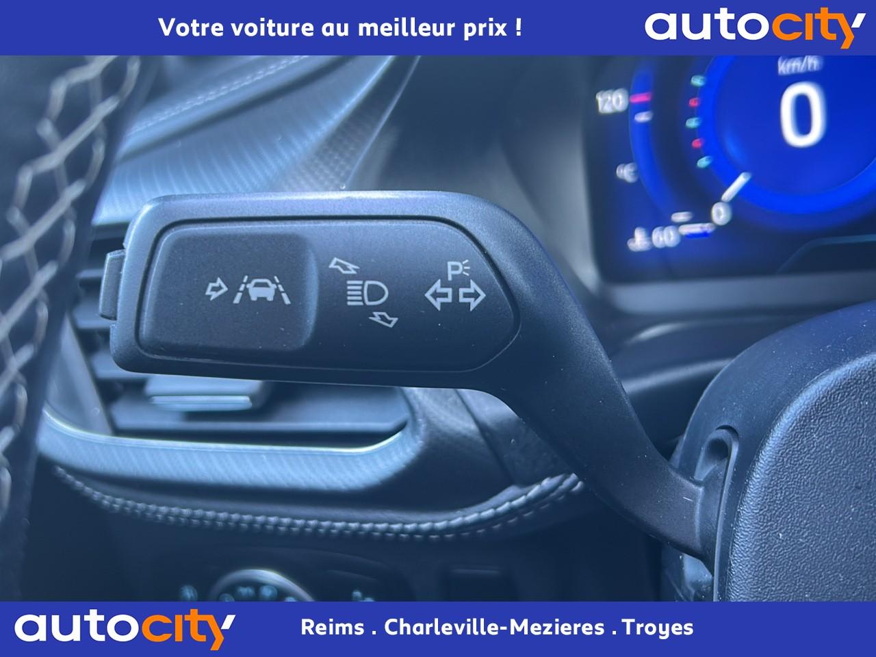 2 Fixations Isofix à l'arrière3 appuie-tête arrière5 ceintures de sécurité 3 points5 Modes de conduite sélectionnables (normal, eco, sport, faible adhérence, trail)Aide au démarrage en côteAide au maintien dans la voie avec détection des bas-côtésAide au stationnement arrièreAirbags frontaux, latéraux (thorax) et rideauxAlerte d'oubli de ceintures avant/arrièreAlerte de franchissement Involontaire de ligneAllumage automatique des projecteursAntipatinageAssistance au freinage d'urgenceBadges ST-LineBanquette arrière rabattable 40/60Bas de caisse couleur carrosserieBecquet arrière couleur carrosserieBouton de démarrage "Ford Power"Climatisation manuelleCombiné d'instrumentation numérique 12,3" avec EcomodeCombiné d'instrumentation TFT couleur 4,2" avec EcomodeConsole centrale avant avec deux porte-gobelets rétroéclairésConsole centrale avec accoudoir et rangementsContour des vitres latérales en noir finition brillanteCorrecteur électronique de trajectoire ESPDésactivation de l'airbag du passager avantDirection assistée électriqueEclairage d'ambiance intérieurFeux arrière à LEDFeux de jour à LEDFeux de route intelligents (passage feux de croisement/route automatique)FordPass Connect avec modem embarqué et fonction eCallFrein à disques à l'avantGrille de calandre ST-LineJantes alliage 17" 5x2 branches finition Black MachinedKit carrosserie ST-LineKit de réparation pneumatiqueLevier de frein à main gainé de SensicoLevier de vitesses gainé de SensicoLimiteur de vitesse intelligentPare-chocs couleur carrosseriePeinture non-métallisée Bleu AbyssePhares avant antibrouillard avec fonction d'éclairage d'anglePlancher de coffre ajustablePrise 12 V sur console centrale avantRégulateur de vitesseRétroviseurs extérieurs électriques couleur carrosserie, dégivrant et rabattables avec rappels de clignotantsSellerie tissu noir CourtSiège conducteur réglable en hauteur avec soutien lombairesSortie d'échappement chroméeSuspensions sportSystème audio Ford SYNC 3 avec écran tactile 8", commandes vocales, 2 ports USB, alerte contresens, compatible AppLink, Apple CarPlay et Android auto, 6 hauts-parleursSystème de freinage antiblocage (ABS)Système de Navigation Europe et points d'intérêt MichelinSystème de prévention de collision avec freinage post-collision et détection piétonsSystème de surveillance de pression des pneusSystème MyKey (seconde clé programmable)Tapis de sol avant avec surpiquresTrappe à carburant Ford EasyFuelVitres électriques avant et arrière avec descente et remontée à impulsionVolant à méplat 3 branches ST-Line avec surpiqûres rouges