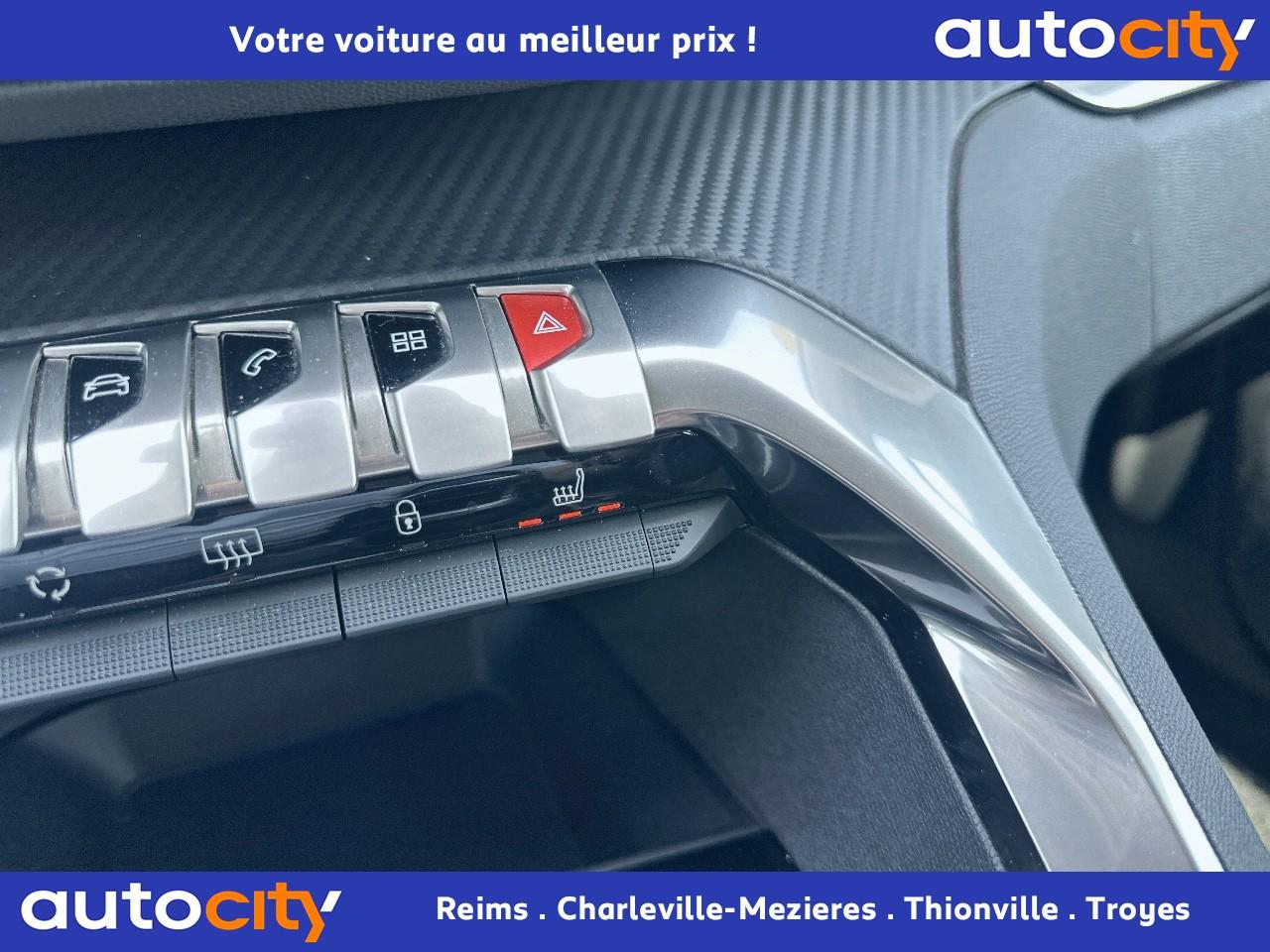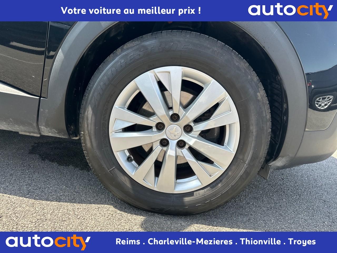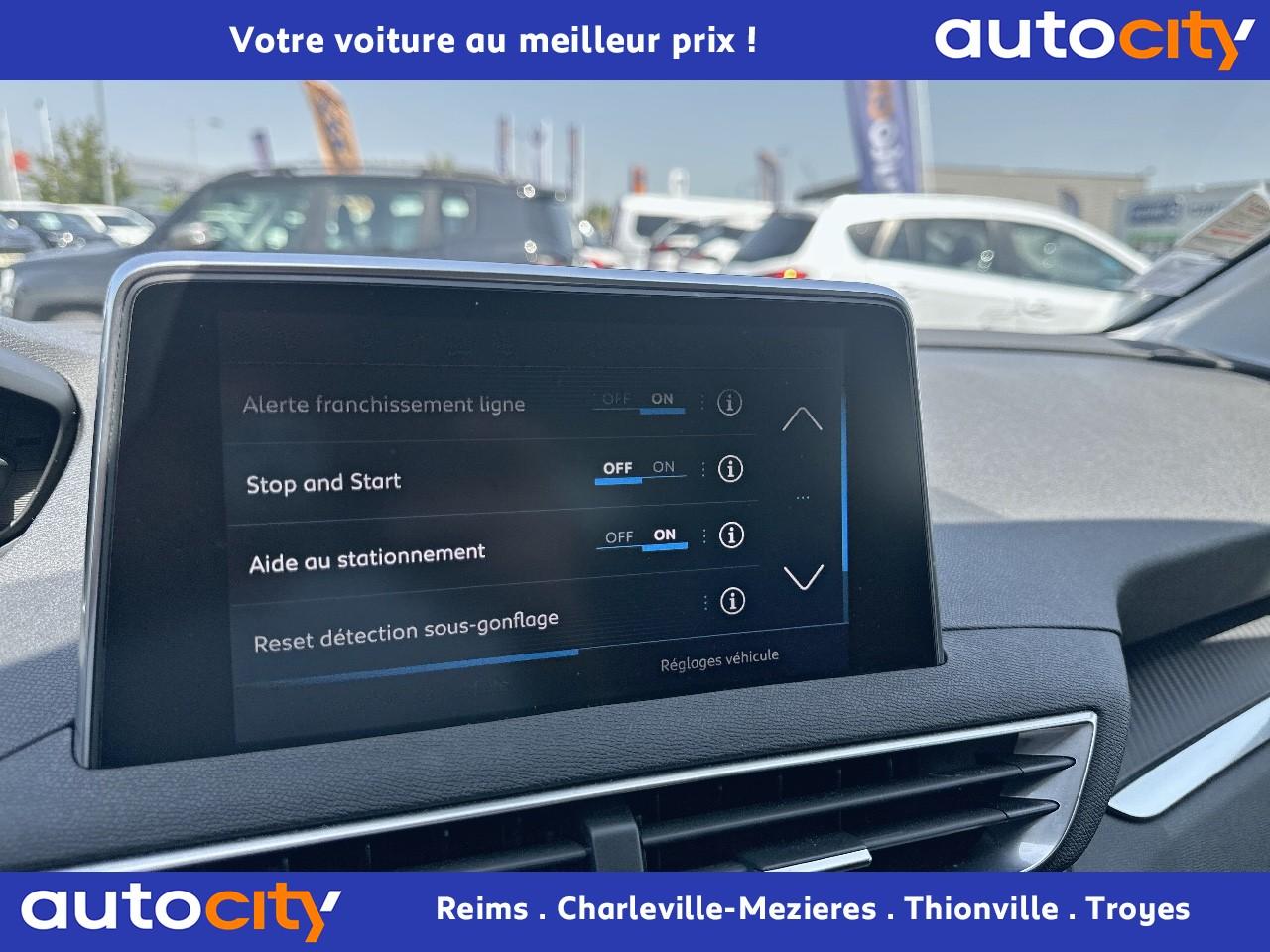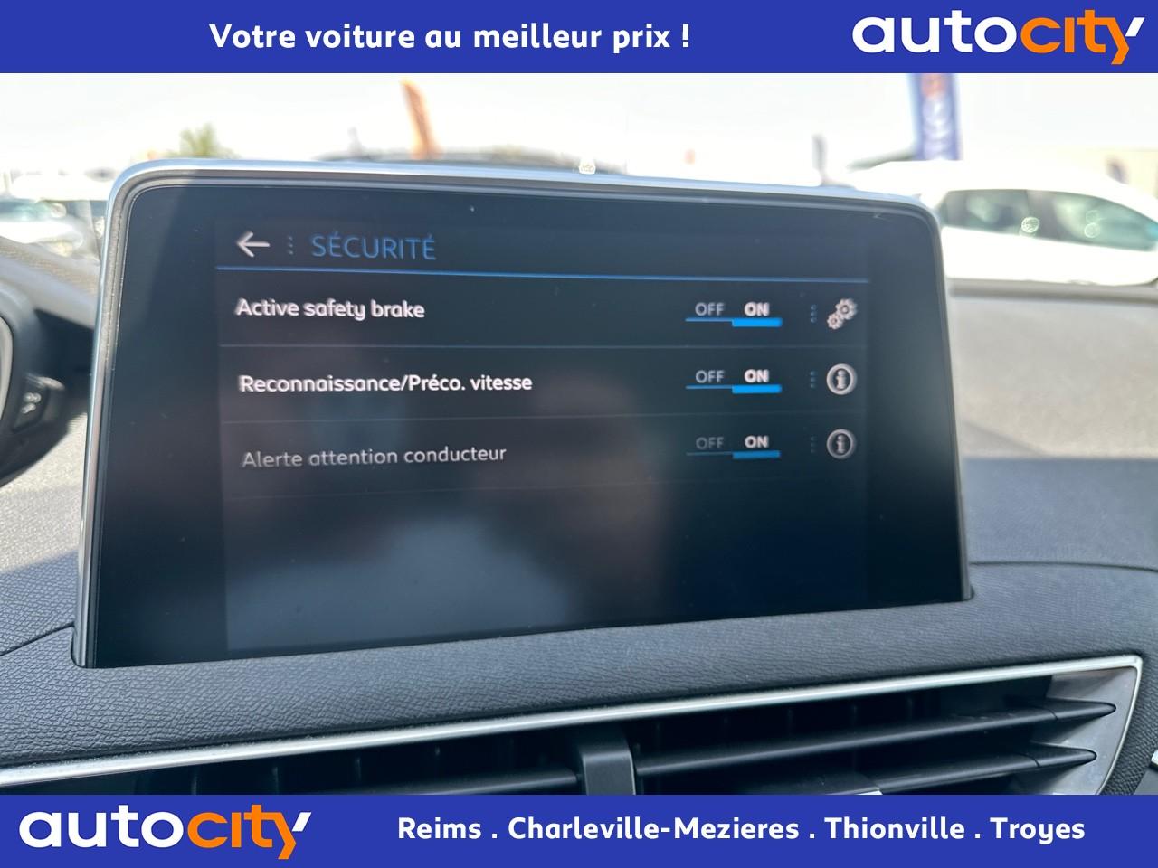 2 spots de lecture à l'arrière4 poignées de maintien rétractables (passagers avant et arrière) et 2 crochets portemanteau à l'arrièreABS avec répartiteur électronique de freinage (REF) et aide au freinage d'urgence (AFU)Accoudoir central avant à ouverture papillon, avec compartiment de rangement éclairé et réfrigérableAide graphique et sonore au stationnement arrièreAir conditionné automatique bi-zone avec aérateurs aux places arrièreAirbags frontaux conducteur et passager adaptatifsAirbags latéraux conducteur et passager avantAirbags rideaux de tête aux places avant et arrièreAlerte de franchissement Involontaire de ligneAlerte de temps de conduiteAppuis-tête à sécurité optimisée réglables en hauteur sur les sièges conducteur et passager avant ainsi que sur les places arrièresBandeau de pare-choc arrière chroméBanquette rabattable 1/3 - 2/3 (modularité 'Magic Flat' et commandes dans le coffre) avec accoudoir et trappe à skisBoîte à gants floquée et éclairéeCalandre avec jonc périphérique et facettes chromésCeintures avant à 3 points, réglables en hauteur, avec prétensionneurs et limiteurs d'effortCeintures de sécurité arrière trois points à enrouleur (x3), avec prétensionneurs et limiteurs d'effort aux places latéralesCommande de verrouillage à distance (deux plips)Contrôle dynamique de stabilité CDS avec antipatinage électronique ASRDécors de planche de bord et panneaux de portes aspect carboneDécors intérieurs (baguettes de planche de bord et panneaux de portes, enjoliveur de console) chromésDétection de sous-gonflage indirecteDeux porte-gobelets intégrés à la console centraleDirection assistée électrique, avec colonne de direction réglable en hauteur et profondeur (mécanique)Eclairage intérieur à LEDEnjoliveurs d'arc de pavillon en inoxEssuie-vitre arrière à activation automatique au passage en marche arrièreEssuie-vitre avant avec système de lavage 'Magic Wash'Filets aumônières au dos des sièges avantFixations pour trois sièges enfants suivant norme ISOFIX aux places passager avant et latérales arrièreFrein de stationnement électrique avec aide au démarrage en penteIndicateur de rapportInserts d'ailes avant chromésJantes alliage 17" 'Chicago'Kit de dépannage pneumatiqueLève-vitres électriques avant et arrière, séquentiels et antipincementLunette arrière chauffante avec antennes sérigraphiéesPack VisibilitéPassages de roues rapportés noirsPeugeot i-Cockpit combiné tête haute numérique reconfigurable, écran tactile capacitif 8" et volant compact multi-fonctionsPlafonnier avant avec spots de lecture (x2) et plafonnier arrière à extinction temporiséePlancher de coffre deux positionsPneus 215/65 R17 VPrise USBPrises 12V (x 3)Projecteurs antibrouillard halogènes avec enjoliveurs chromésProjecteurs halogènes à l’avant avec feux diurnes à LED intégrés dans le bloc optiqueRégulateur et limiteur de vitesseRétroviseurs extérieur électriques et dégivrantsRétroviseurs extérieurs couleur carrosserieRadio 6 HP, bi-tuner compatible MP3 et connectivité Bluetooth (audio streaming, kit mains libres), avec commandes au volant, écran tactile capacitif 8"Reconnaissance des panneaux de vitesse et préconisationSellerie Tissu 'Meco'Siège conducteur réglage en hauteurSiège passager à réglage manuel en hauteurTeinte de caisse Gris HurricaneToggle Switches' chromés (touches 'piano' d'activation des fonctions de l'écran tactile)Verrouillage automatique de tous les ouvrants en roulantVitres électriques AR avec sécurité enfantVolant cuir pleine fleur